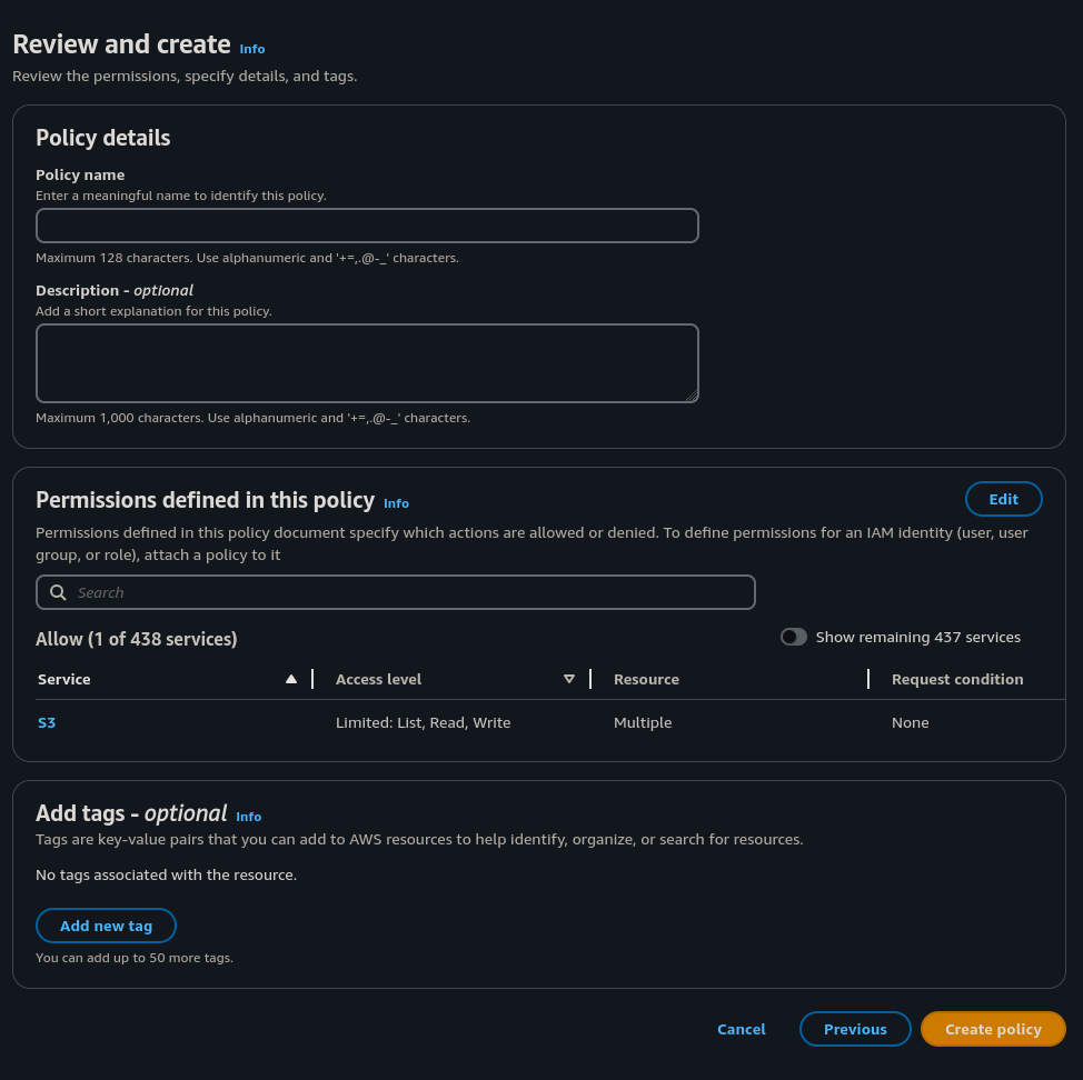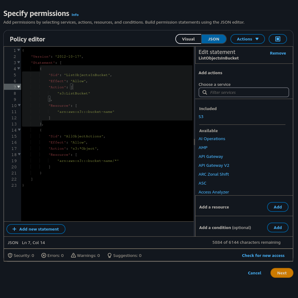 3. Click Next and then set the necessary permissions. You can define the policy by selecting Attach policies directly and then clicking Create policy. The policy can be defined in JSON format by selecting the JSON button. Write access is necessary to allow Decentriq to upload data to the bucket. See here for more details on creating the read/write policies.