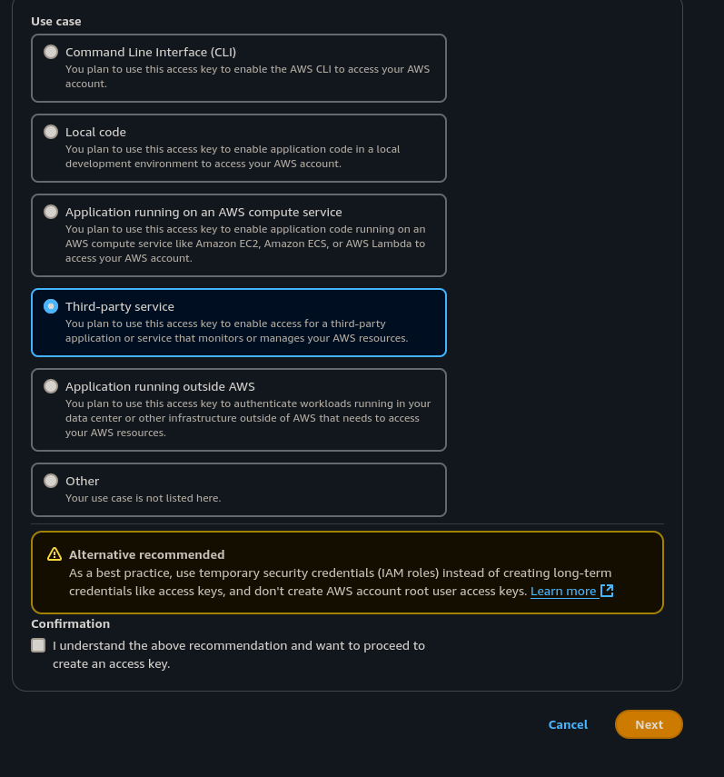• Have created IAM credentials with write permissions for the above bucket. The access key and secret key are required when exporting.
