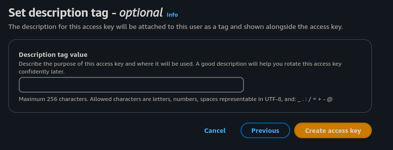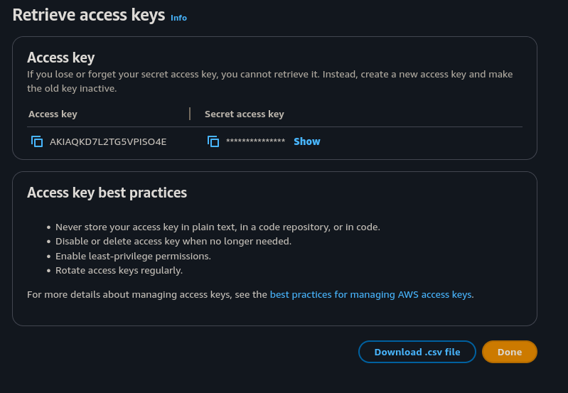 9. Click Create access key and then click Download .csv file. Make sure you store this securely as the access key and secret key will be required when exporting data.