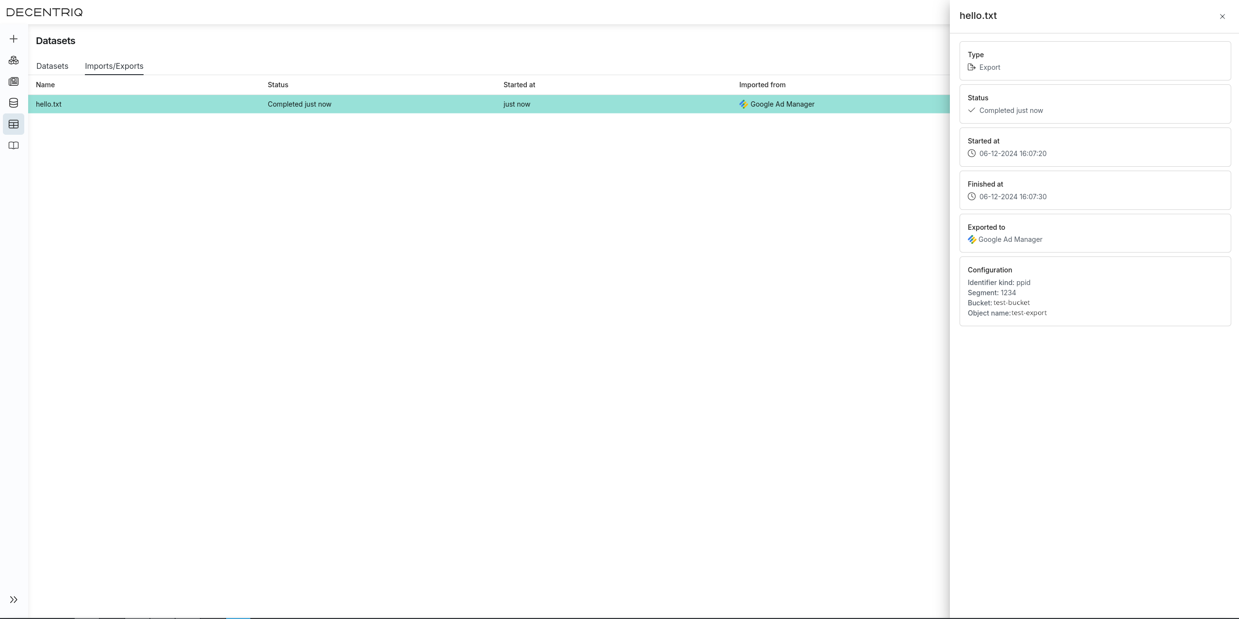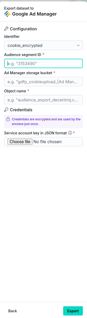 The Google Ad Manager connector provides a convenient way of exporting data directly from the Decentriq platform to Google Ad Manager as an audience segment. Data is uploaded to a GCS bucket which can then be accessed by Google Ad Manager.