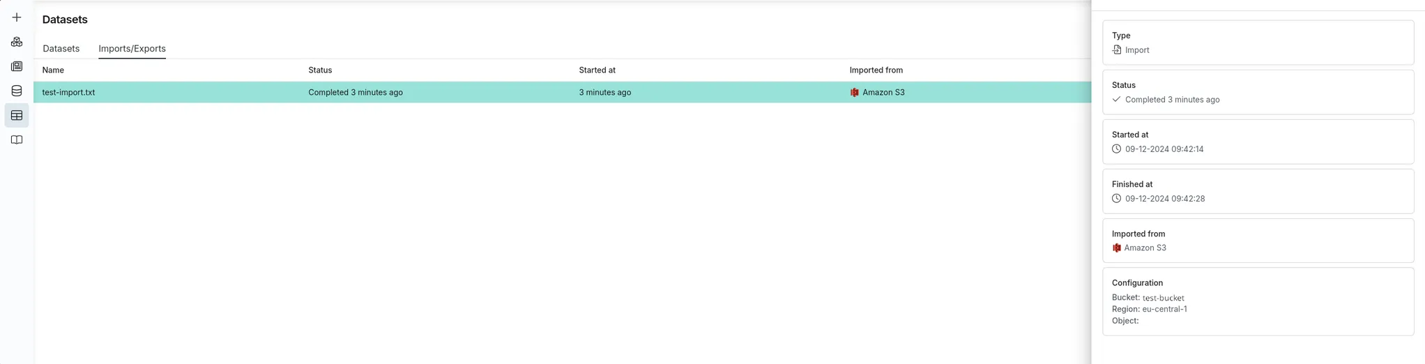 After clicking the Import button, navigate to the Imports/Exports tab on the Datasets page to track the status of the import.