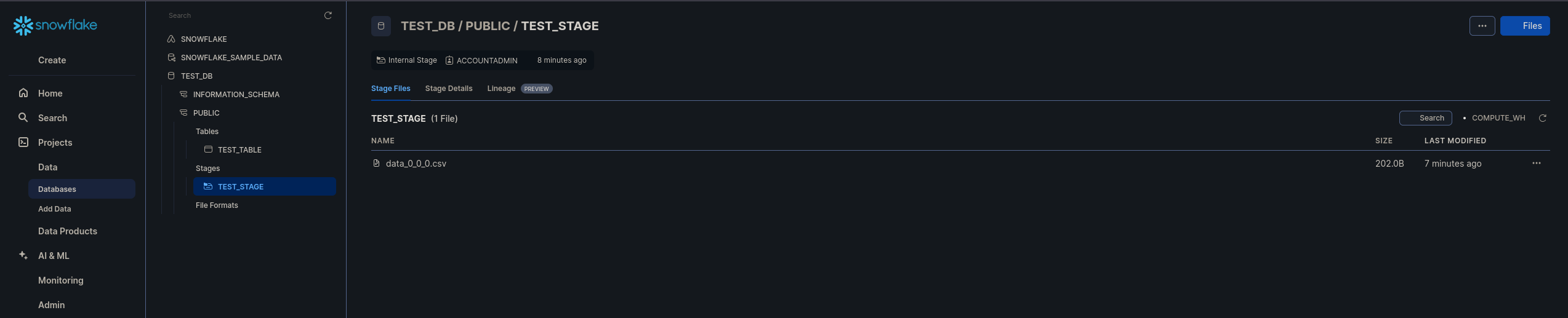 Upon successful completion of the above steps, one or more csv files should be present in your internal stage. This can be verified by logging into your Snowflake account and clicking through on your database > schema > stages.